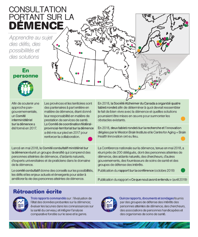 La Conférence nationale sur la démence, tenue en mai 2018, était une étape clé de l'élaboration de la stratégie. Elle a réuni près de 200 participants, y compris des personnes atteintes de démence et des aidants naturels, en vue de cerner les défis, les solutions et les possibilités liés à la démence. Avant la conférence, la Société Alzheimer du Canada a tenu 4 tables rondes productives avec les intervenants qui ont eu lieu partout au pays en mars 2018, à Vancouver, Montréal, Saint John et Fredericton. Elles ont réuni près de 160 participants, dont 15 personnes atteintes de démence, pour discuter de ce à quoi ressemble une vie saine avec la démence. Deux autres tables rondes sur la recherche et l'innovation dirigées par le Weston Brain Institute et le Centre for Aging + Brain Health Innovation ont eu lieu. Ces tables rondes réunissaient des chercheurs, des personnes atteintes de démence, des groupes de défense des intérêts, des professionnels de la santé et des représentants provinciaux et territoriaux. Les participants aux tables rondes ont discuté de la meilleure façon d'utiliser l'innovation pour bien vivre avec la démence et de solutions pour surmonter les obstacles existants, et ont cerné des priorités sur lesquelles devraient être axées la recherche et l'innovation sur la démence.