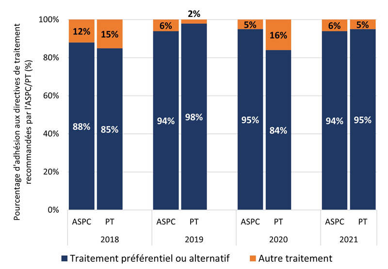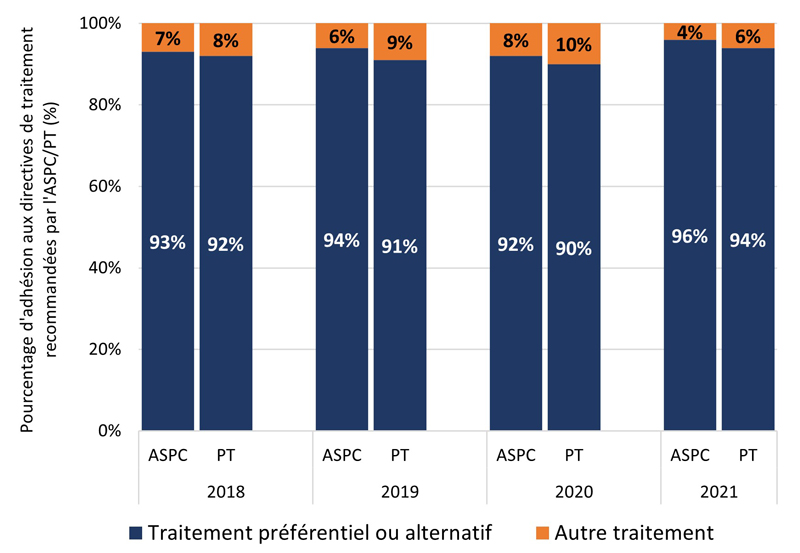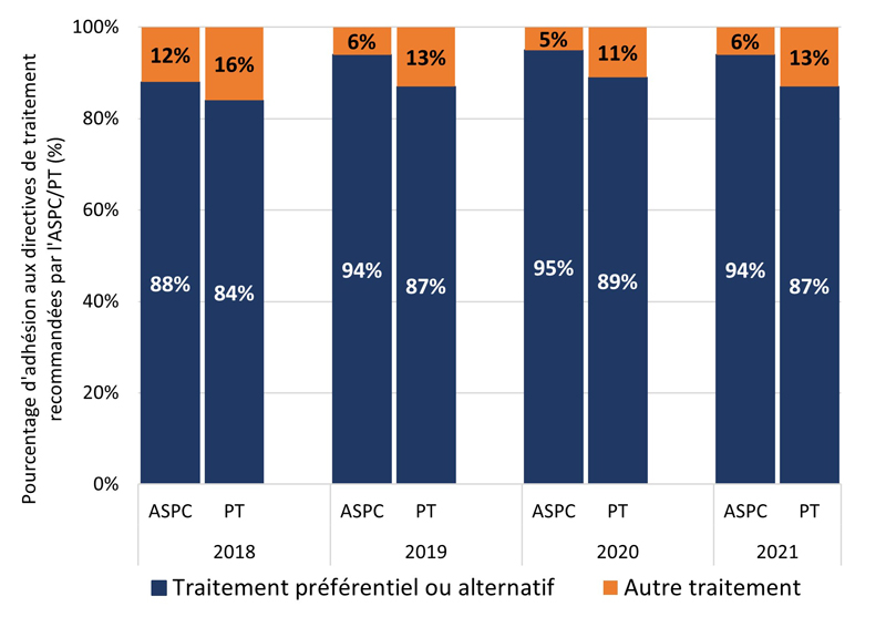 - Parmi les cas SARGA présentant un site d'infection primaire anogénital (défini comme un site d'isolement par écouvillonnage du GC cervical, rectal ou urogénital) ou pharyngé de 2018 à 2021, l'adhésion globale des prescripteurs aux lignes directrices de traitement de la gonorrhée de l'ASPC et des provinces ou territoires (PT) était élevée (moyenne de 91,4 % d'adhésion aux lignes directrices de l'ASPC et de 89,5 % d'adhésion aux lignes directrices des PT) et principalement stable. L'adhésion des prescripteurs aux lignes directrices de traitement était similaire selon le comportement sexuel et le site d'infection; les cas parmi les GBHARSAH se sont vu prescrire principalement le régime de traitement recommandé d'azithromycine 1 g avec ceftriaxone 250 mg et tous les autres cas adultes se sont vu prescrire principalement le régime de traitement recommandé d'azithromycine 1 g avec céfixime 800 mg.