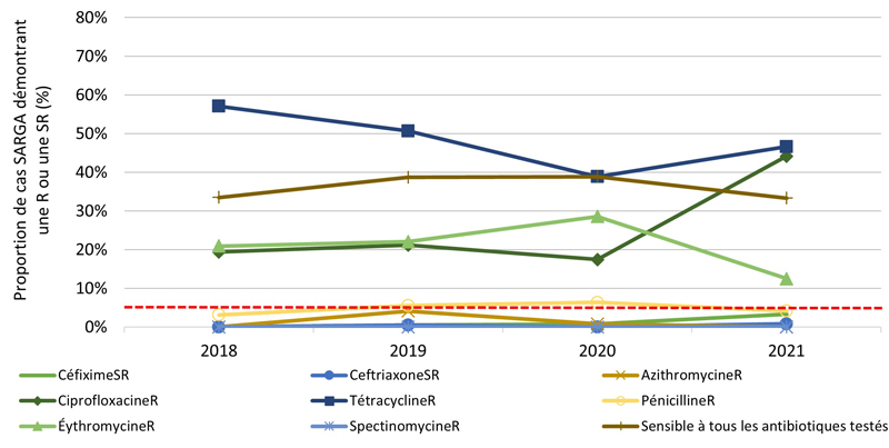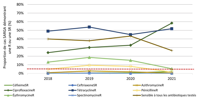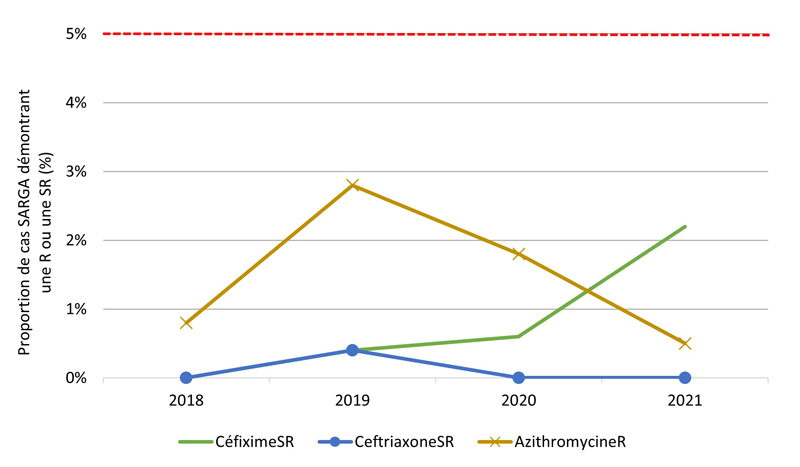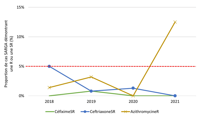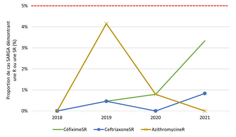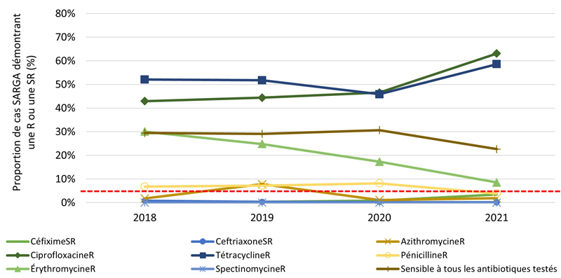 - Les cas SARGA présentant une sensibilité réduite à la ceftriaxone (ceftriaxoneSR) ont diminué en nombre et en proportion, passant de huit cas (0,8 %) en 2018 à un cas (0,2 %) en 2021.