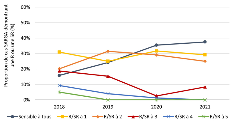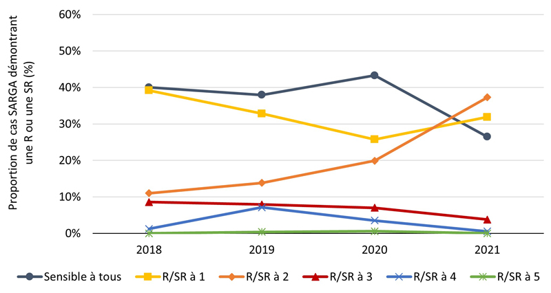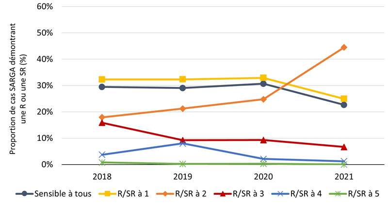 - 4.3.4. Sensibilité aux antimicrobiens parmi les cas SARGA, 2018 à 2021