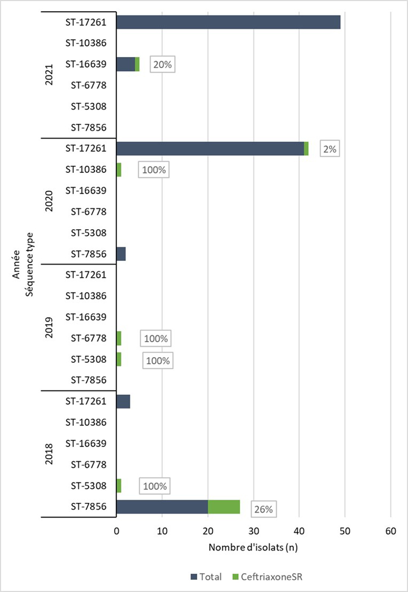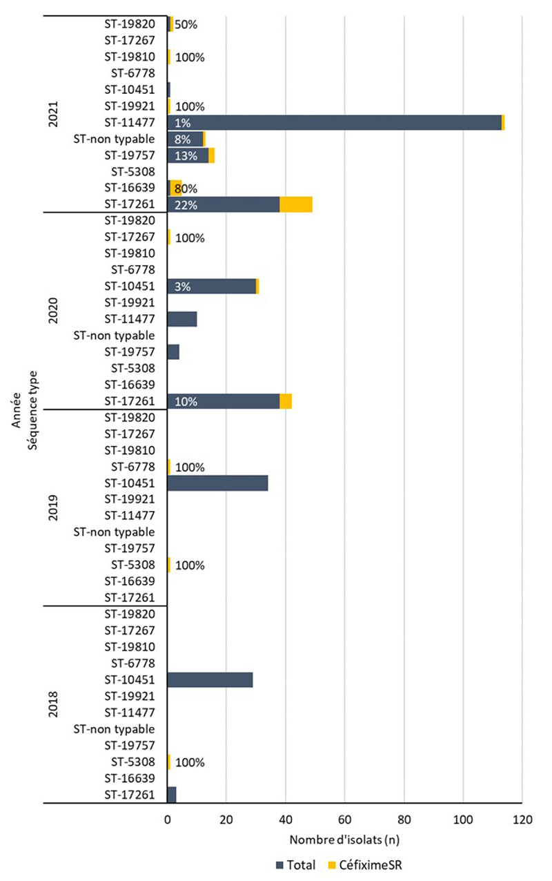 Le céfiximeSR a augmenté de manière significative, passant de 0,6 % en 2017 à 1,5 % en 2021 (p < 0,001), mais a également diminué de manière significative par rapport aux 2,8 % rapportés en 2020 (p < 0,001) La proportion plus élevée d'isolats avec céfiximeSR en 2020 a été principalement causée par des isolats identifiés comme ST-16639 en Ontario et au Québec. La proportion de cette ST a diminué de 3,3 % (n=53/1 590) en 2020 à 1,3 % (n=26/2 006) en 2021. |