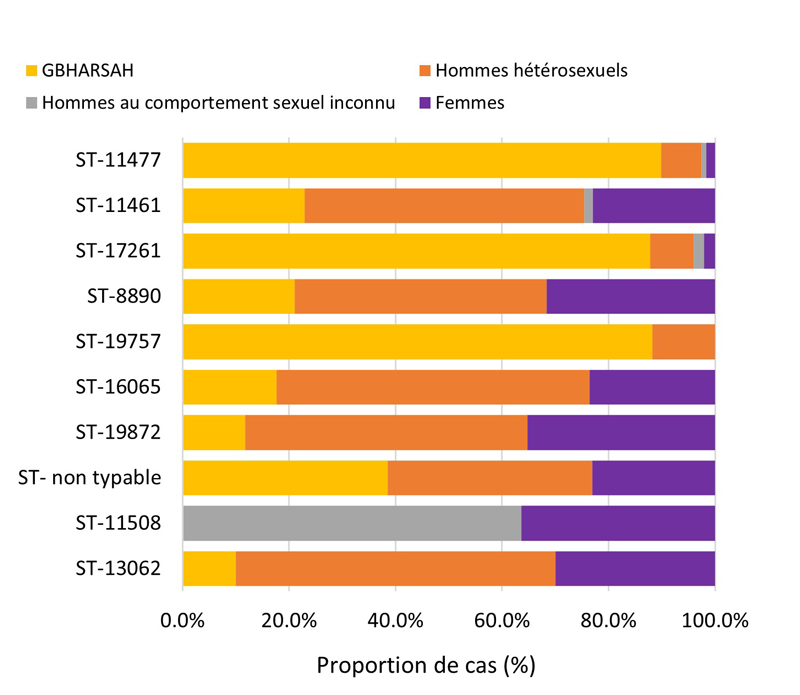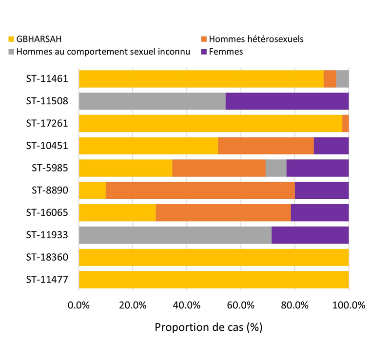 - la plupart des cas étaient des hommes (80,2 %, n=2709), dont 55,5 % en moyenne était des hommes gais, bisexuels et autres hommes ayant des relations sexuelles avec des hommes (GBHARSAH).