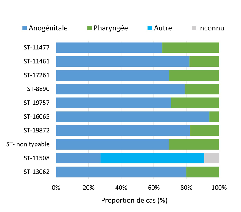 | En 2021, le site d'isolement gonococcique primaire le plus répandu chez les hommes était le pénis/l'urètre (56,8 %) et la gorge chez les femmes (33,8 %, 148/438). | Entre 2018 et 2021, le site d'isolement primaire du gonocoque le plus prévalent pour les hommes et les femmes était génital (34,6 % pour les femmes et 51,8 % pour les hommes). Il était suivi par le rectum pour les hommes (23,7 %) et le pharynx pour les femmes (32,4 %). Chez les hommes, le principal site d'infection par GC était, chez les GBHARSAH, rectal (39,3 %) et pharyngé (34,6 %) et, chez les hétérosexuels, le pénis/l'urètre (c'est-à-dire les organes génitaux) (26,1 %). |