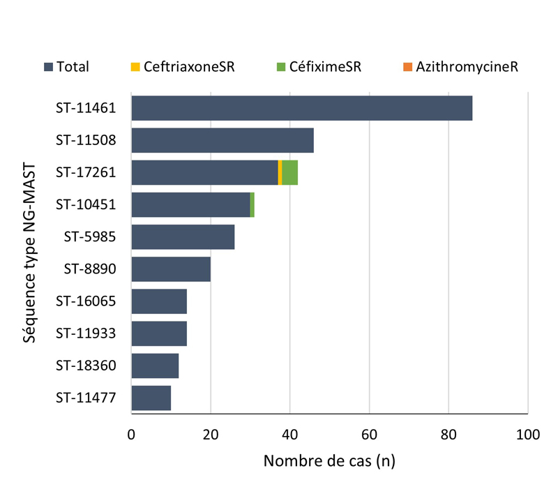 - Entre 2018 et 2020, 396 séquences types (ST) uniques par typage de séquences multi-antigènes de N. gonorrhoeae (N. gonorrhoeae multiantigen sequence typing (NG-MAST)) ont été identifiés à partir de 3 377 isolats de N. gonorrhoeae prélevés dans des cas SARGA. Dans l'ensemble, il n'y a pas eu de tendance claire à l'augmentation ou à la diminution de la prévalence de l'azithromycineR, du céfiximeSR ou de la ceftriaxoneSR parmi les 10 principaux ST pour chaque année.