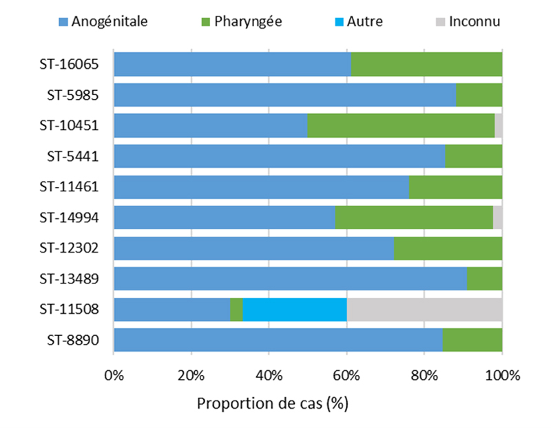 Les cas déclarés comme masculins qui ont déclaré que leurs partenaires sexuels étaient des hommes, ou des hommes et des femmes, ont été classés dans la catégorie « GBHARSAH ». Les « hommes hétérosexuels » ont été définis comme les cas de sexe masculin qui ont déclaré n'avoir que des partenaires féminines. Enfin, les « hommes au comportement sexuel inconnu » ont été définis comme les cas masculins qui n'avaient pas d'informations sur leurs partenaires sexuels. - Site d'infection primaire (site d'infection) :