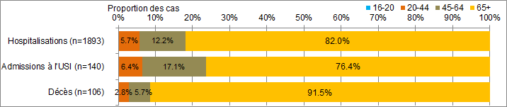 | Groupes d'âge (ans) | Hospitalizations (n=1893) | Admissions à l'USI (n=140) | Décès (n=106) |
