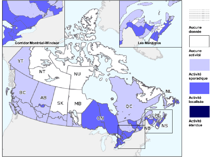 Au cours de la semaine 09, aucune activité étendue n'a été signalée. Dix-sept régions ont signalé une activité localisée : Alb., Ont.(7), Que., N.-B.(3), N.-É.(4), et T.-N.-L. Vingt-sept régions ont signalé une activité sporadique: Yn., C.-B.(5), Alb.(4), Sask.(2), Man.(3), Qc.(5), N.-B.(3), N.-É.(2), Î.-P.-É., et T.-N.-L. Aucune activité n'a été signalée dans quatorze régions: Nt.(3), T.-N.-O.(2), SK, Man.(2), N.-B., N.-É.(3) et T.-N.-L.(2). Il y a eu une diminution globale de l'activité grippale par rapport à la semaine précédente; moins de régions ont signalé l'activité et aucune région n'a signalé d'activité étendue.