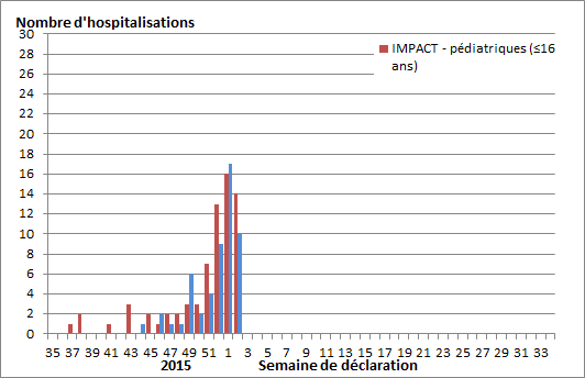 Depuis le début de la saison 2015-2016, 274 hospitalisations associées à la grippe confirmée en laboratoire ont été signalées. Deux cent quarante hospitalisations (88 %) étaient attribuables à la grippe A et 34 cas (12 %) étaient attribuable à la grippe B. Parmi les cas pour lesquels le sous-type de grippe A était connu, 65 % (101/156) étaient attribuables au virus A(H1N1). La majorité (40 %) des patients hospitalisés étaient âgés d’au moins 65 ans. Vingt-huit admissions dans une unité des soins intensifs et 12 décès ont été signalés.