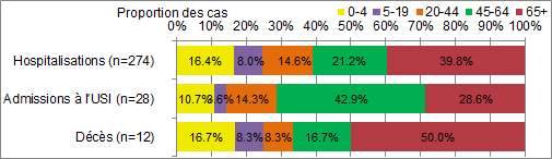 | Groupes d'âge (ans) | Hospitalisations (n=274) | Admissions à l'USI (n=28) | Décès (n=12) |