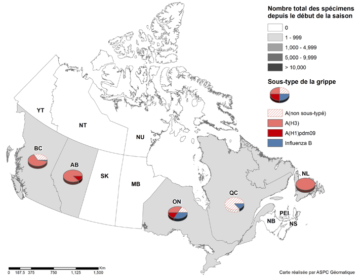- Dans l'ensemble, il existe une faible activité grippale au Canada; toutefois, l'activité grippale et les détections sont à la hausse particulièrement en Colombie-Britannique.
