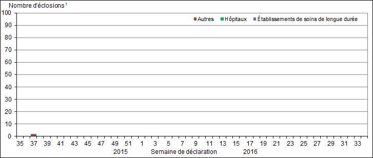 Au cours de la semaine 37, deux nouvelles éclosions de la grippe ont étés signalées : un dans un établissement de soin de longue durée et un dans un milieu communautaire (figure 5) L’éclosion dans un milieu communaitaire .tait associ.e au virus A(H3). Aucune nouvelle éclosion de la grippe n'a été signalée au cours de la semaine 38.