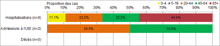 | Groupes d'âge (ans) | Hospitalisations (n=9) | Admissions à l'USI (n=2) | Décès (n=0) |