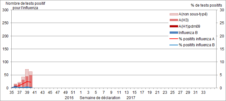 - Au cours des semaines 39 et 40, un total de 127 tests positifs pour la grippe ont été signalés. Le virus de la grippe A(H3N2) était le sous-type de gripple le plus commun en circulation au Canada et la majorité des tests positifs pour la grippe a été signalée chez les adultes de ≥65 ans.