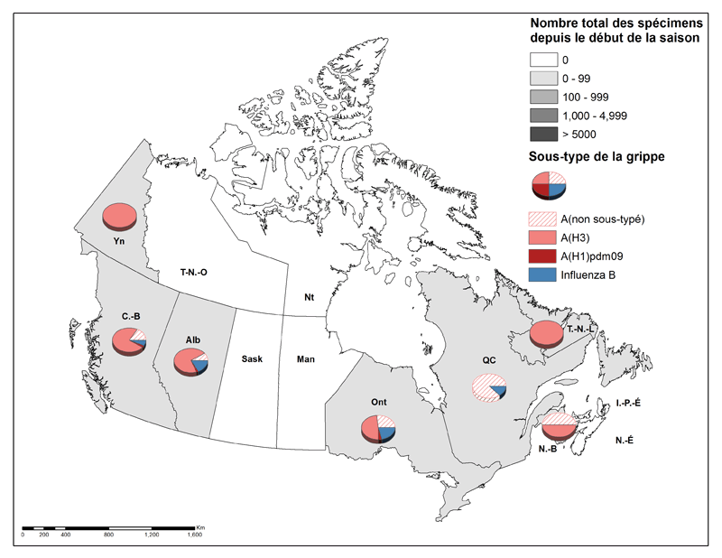 À l'échelle nationale, au cours des semaines 39 à 40, 127 tests positifs pour la grippe ont été signalés. Le virus de la grippe A(H3N2) était le sous-type de gripple le plus commun en circulation au Canada lors des semaines 39 et 40. La majorité des régions n'ont signalé aucune détection de grippe (Sask., Man., N-É., I-P-É., TN.-O., Nt). Pour obtenir des données cumulatives hebdomadaires plus détaillées sur la grippe, veuillez lire la description pour les figures 2 et 3 ou le rapport intitulé Détection de virus des voies respiratoires au Canada.