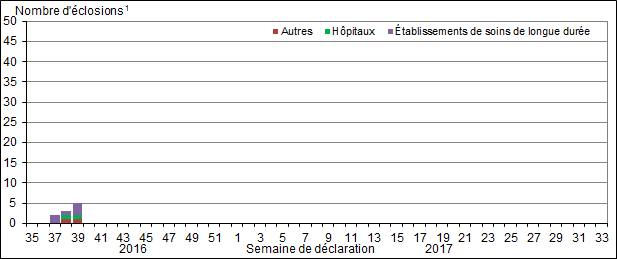 - Au total, six éclosions ont été signalées. Toutes les éclosions ont été signalées lors de la semaine 39.