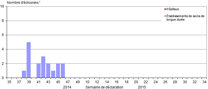 1 L'ensemble des provinces et territoires, à l'exception du Nunavut, déclarent les éclosions de la grippe dans les établissements de soins de longue durée. L'ensemble des provinces et territoires, à l'exception du Nunavut et du Québec, signalent les éclosions dans les hôpitaux. Les éclosions de la grippe ou du syndrome grippal dans d'autres établissements sont déclarées au programme Surveillance de l'influenza, mais les déclarations varient selon la région. La définition d'une éclosion est donnée à la fin du rapport.