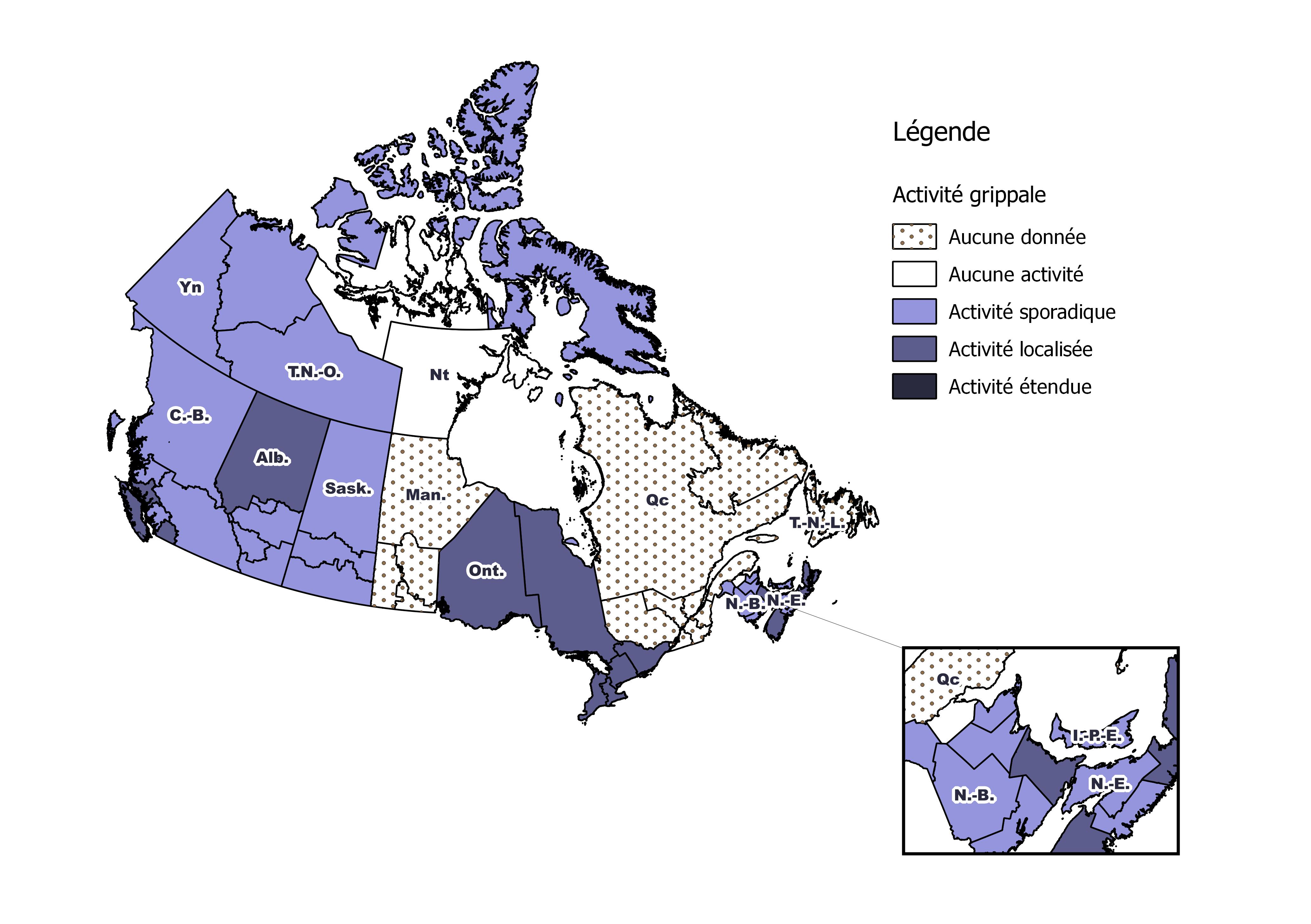 Note : Les niveaux d'activité, tels que représentés sur cette carte, sont attribués et enregistrés par les ministères de la santé provinciaux et territoriaux. Ceci est basé sur les confirmations de laboratoire, les taux de consultation de syndrome grippal des médecins sentinelles et les éclosions. Veuillez vous référer aux définitions détaillées de la dernière page. Les rapports de semaines précédentes, y compris les mises à jour rétrospectives, sont disponibles sur le site Web de Surveillance de l'influenza.