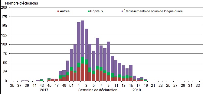 Les éclosions de grippe et de syndrome grippal sont déclarées par toutes les provinces et tous les territoires, selon les définitions ci-dessous. Toutefois, la déclaration des éclosions de grippe et de syndrome grippal par différents types d’établissements varie selon le territoire de compétence. L'ensemble des provinces et territoires, à l'exception du Nt, déclarent les éclosions de la grippe dans les établissements de soins de longue durée. L'ensemble des provinces et territoires, à l'exception du Nt et du Qc, signalent les éclosions dans les hôpitaux.