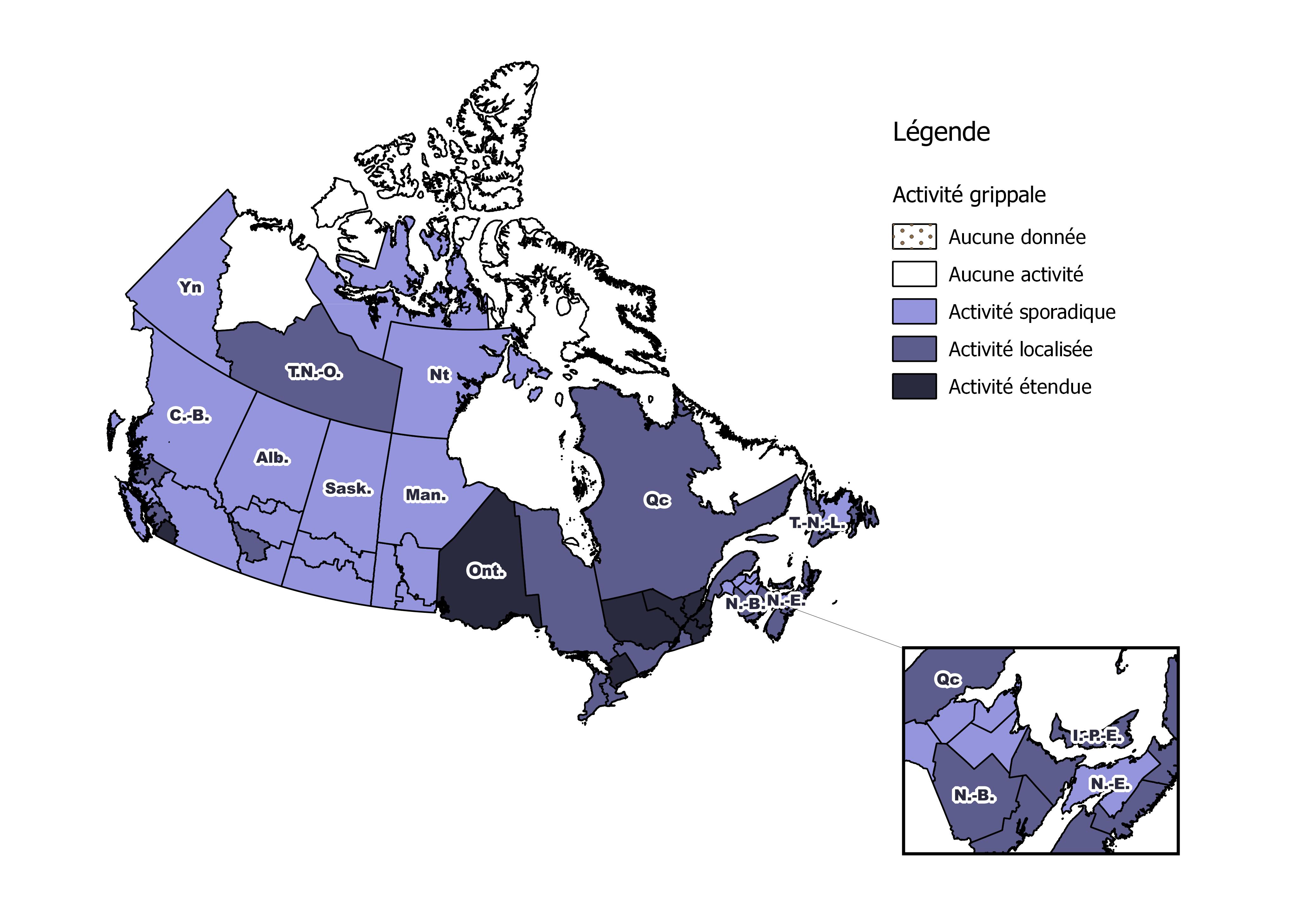 Note : Les niveaux d'activité, tels que représentés sur cette carte, sont attribués et enregistrés par les ministères de la santé provinciaux et territoriaux. Ceci est basé sur les confirmations de laboratoire, les taux de consultation de syndrome grippal des médecins sentinelles et les éclosions. Veuillez vous référer aux définitions détaillées de la dernière page. Les rapports de semaines précédentes, y compris les mises à jour rétrospectives, sont disponibles sur le site Web de Surveillance de l'influenza.