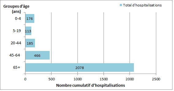 À ce jour, 446 hospitalisations chez les enfants ont été signalées par le réseau IMPACT, dont 299 (67 %) étaient associées à la grippe A. Les enfants de 0 à 23 mois représentaient la plus grande proportion de cas de grippe A (40 %) et la plus faible proportion de cas de grippe B (22 %). Parmi les 147 hospitalisations associées à la grippe B, les enfants de 5 à 9 ans représentaient la plus grande proportion de cas (29 %).