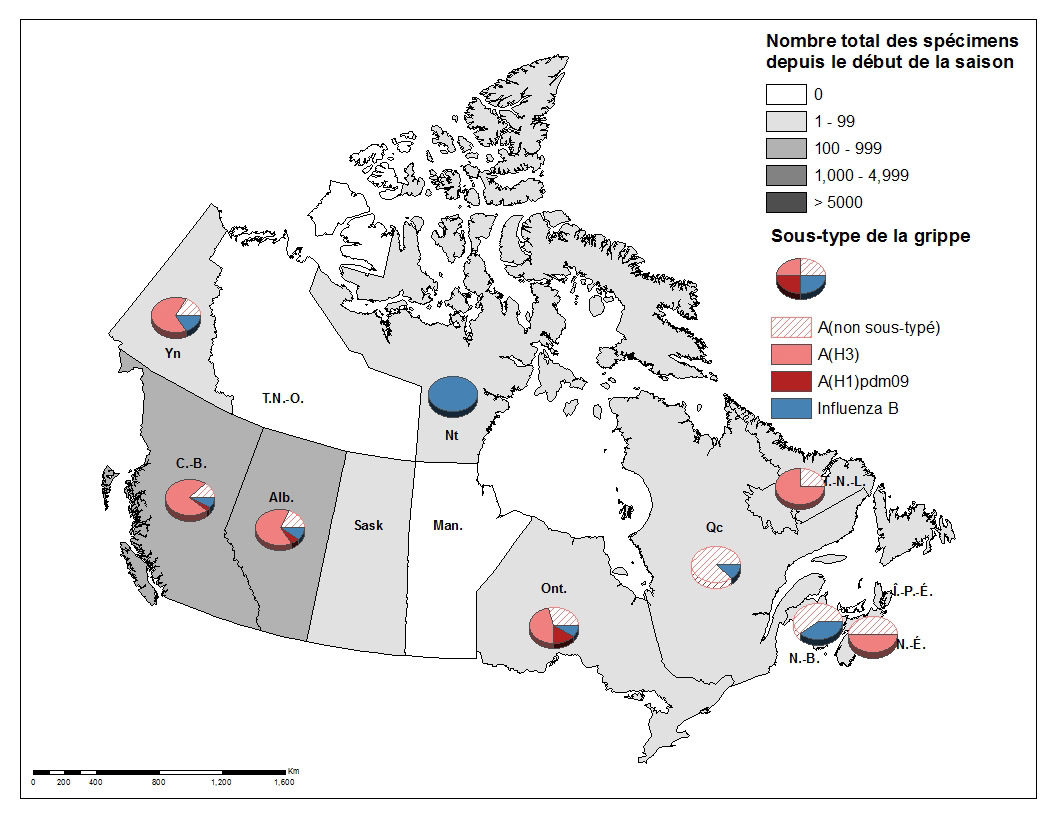 - Le pourcentage de tests de laboratoire positifs pour la grippe est plus élevé pour cette période de l’année, par rapport aux saisons précédentes. La majorité des détections de grippe continuent d’être de type A (H3N2).