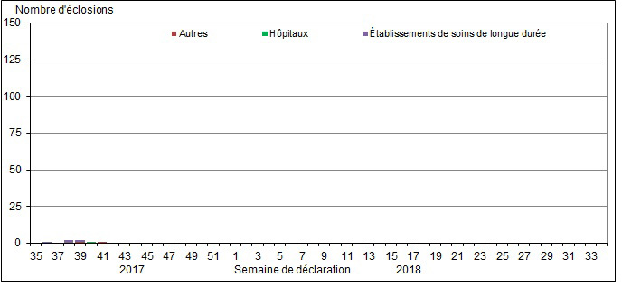 Les éclosions de grippe et de syndrome grippal sont déclarées par toutes les provinces et tous les territoires, selon les définitions ci-dessous. Toutefois, la déclaration des éclosions de grippe et de syndrome grippal par différents types d'établissements varie selon le territoire de compétence. L'ensemble des provinces et territoires, à l'exception du Nt, déclarent les éclosions de la grippe dans les établissements de soins de longue durée. L'ensemble des provinces et territoires, à l'exception du Nt et du Qc, signalent les éclosions dans les hôpitaux.