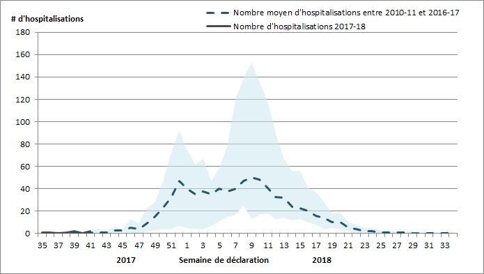À ce jour cette saison, 35 hospitalisations associées à la grippe ont été signalées, toutes associées à la grippe A et 22 cas (63 %) concernaient des adultes âgés de 65 ans ou plus. Bien que le nombre de cas soit resté faible, il est légèrement supérieur à celui ayant été déclaré pendant cette période l'année dernière.