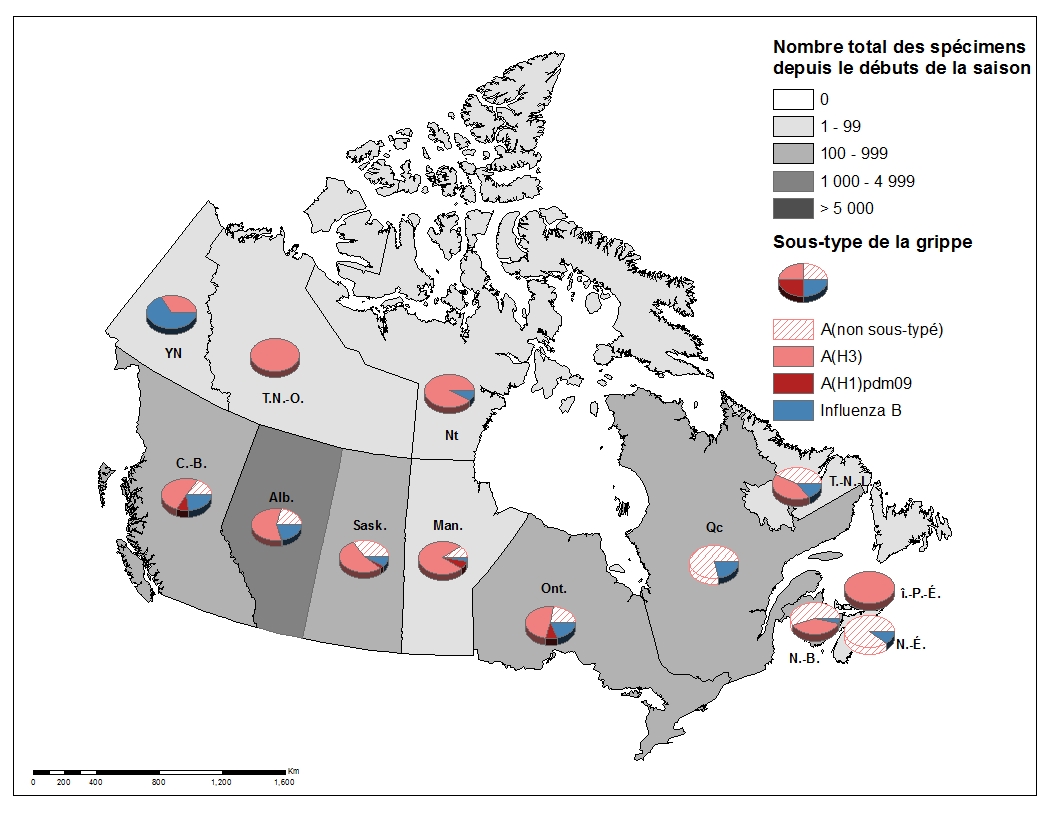 - Dans l’ensemble, l’activité grippale continue d’augmenter au Canada; toutefois, de nombreux indicateurs comme les hospitalisations, les éclosions et la propagation géographique sont demeurés semblables à la semaine précédente.