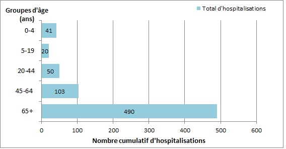 À ce jour cette saison, 704 hospitalisations associées à la grippe ont été signalées, 89 % associées à la grippe A et 490 cas (70 %) concernaient des adultes âgés de 65 ans ou plus. Le nombre de cas est considérablement élevé par rapport à celui ayant été déclaré pendant cette période durant les deux années précédentes. À ce jour cette saison, 47 admissions à l’unité de soins intensifs et 19 décès ont été signalés.