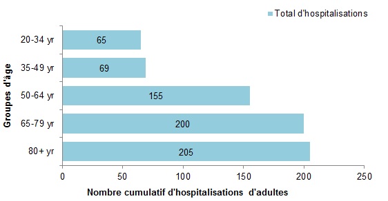 - Une plus grande proportion d’hospitalisations a été signalée parmi les adultes âgés de 65 ans et plus (58 %) par rapport à ceux âgés de moins de 65 ans (42 %).