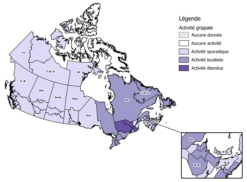 - 17 régions ont signalé une activité localisée : en Ont.(6), Qc. (2), T.-N.-L.(3), N.-É.(2) et N.-B.(4)
