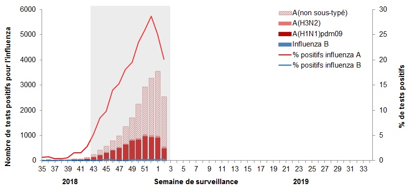 - Au total 2 486 détections de grippe en laboratoire ont été signalées, dont 98 % étaient de type A.