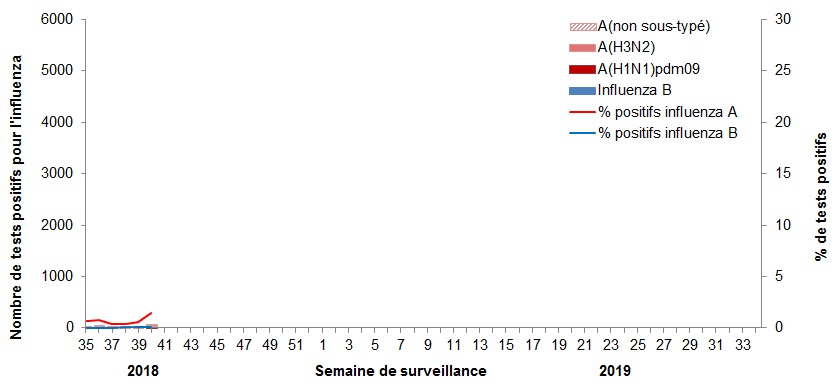 - Le pourcentage de tests positifs pour la grippe étaient de 0, 67 % et de 1,58 % au cours des semaines 39 et 40, respectivement.