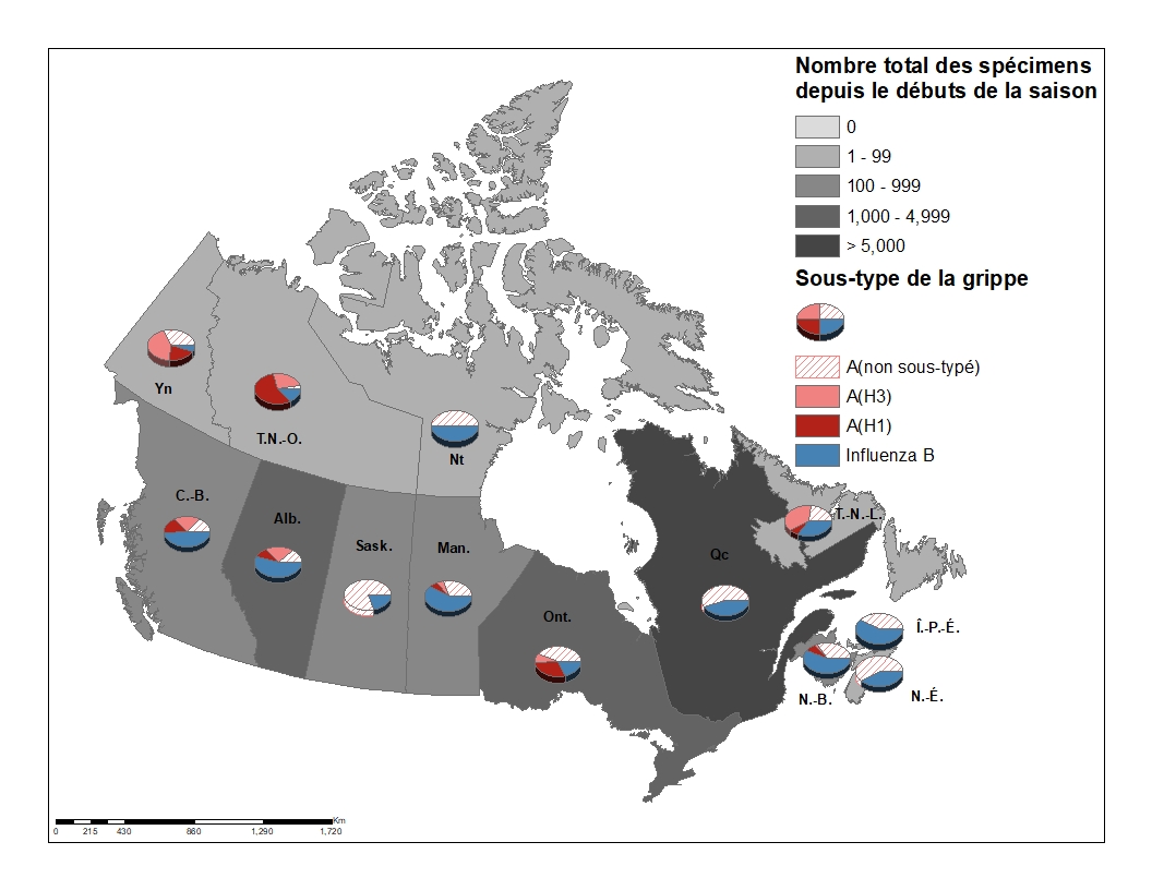 - Parmi les détections de grippe A sous-typée (2 932), le virus A(H1N1) est maintenant le sous-type prédominant dans l’ensemble cette saison avec une légère majorité (53 %), en raison de l’augmentation des détections de grippe A(H1N1) au cours des dernières semaines.