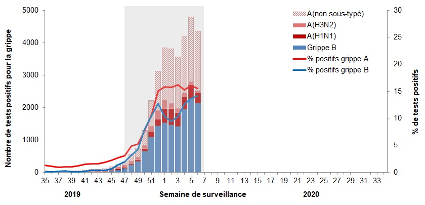 - Le pourcentage de tests positifs pour la grippe B était de 14 % à la semaine 06. Ce taux est toujours trois fois supérieur à la moyenne (4,6 %) pour cette période de l'année.