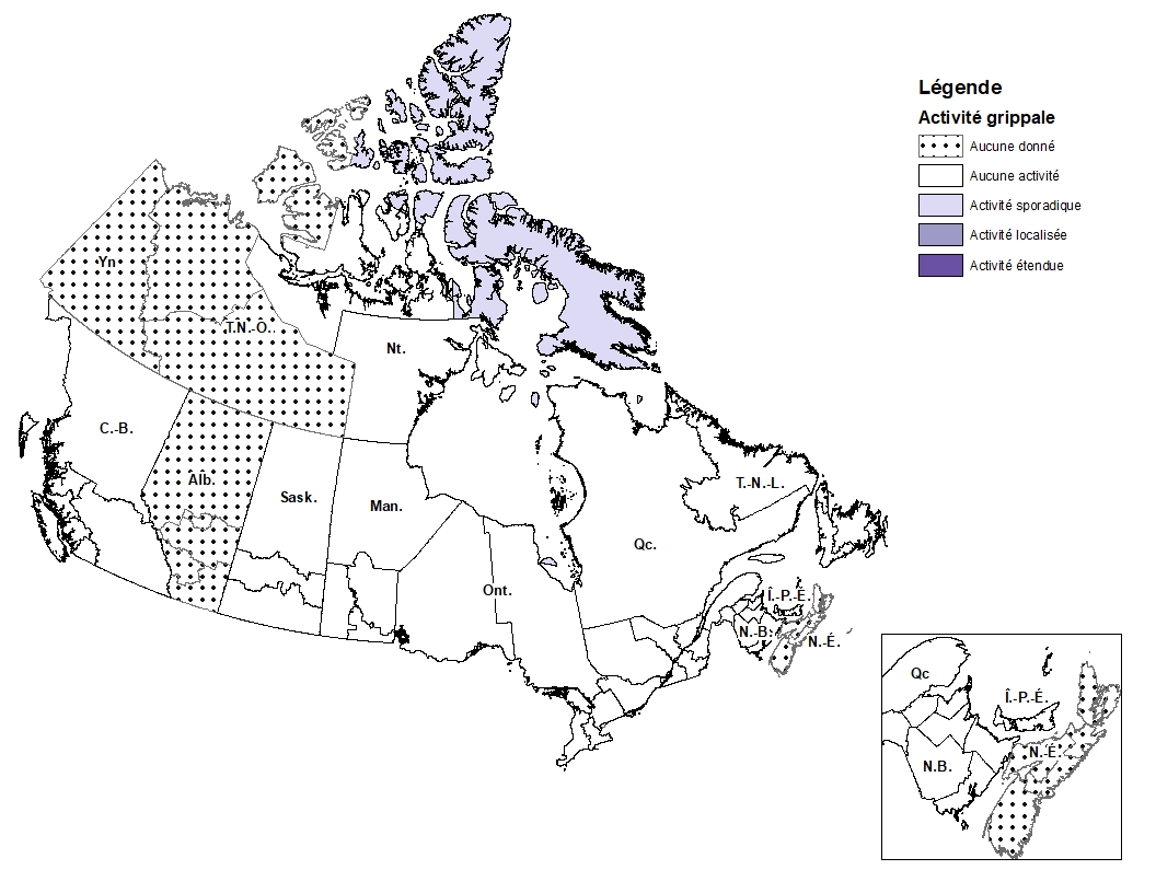 Des hospitalisations attribuables à la grippe sont déclarés par l'Alberta, le Manitoba, le Nouveau-Brunswick, Terre-Neuve-et-Labrador, l'Île-du-Prince-Édouard, la Nouvelle-Écosse, les Territoires du Nord-Ouest, et le Yukon. Seules les hospitalisations nécessitant des soins médicaux intensifs sont signalées par la Saskatchewan.