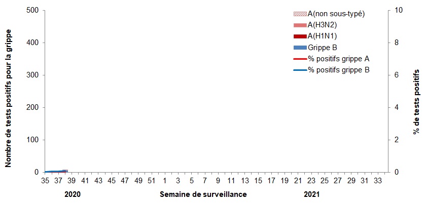 - Au cours des semaines 35 à 38, le pourcentage de résultats positifs au test de dépistage de la grippe (0,05 %) est demeuré bien en deçà de la moyenne comparativement aux six dernières saisons. La proportion de visites en soins primaires pour un syndrome d'allure grippale (SAG) est resté inférieure à la moyenne; aucune éclosion, et aucune hospitalisation liée à la grippe n'a été signalée.