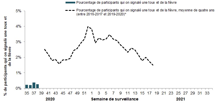 Au cours de la semaine 38, 9 729 participants ont soumis des données au programme ActionGrippe. Un total de 25 participants (0,26%) ont signalé des symptômes de toux et de fièvre (figure 5). Le pourcentage de participants qui signalent une toux et de la fièvre se situe à des niveaux très bas qui peuvent être attribuables aux mesures de santé publique adoptées pour réduire la propagation de la COVID-19.