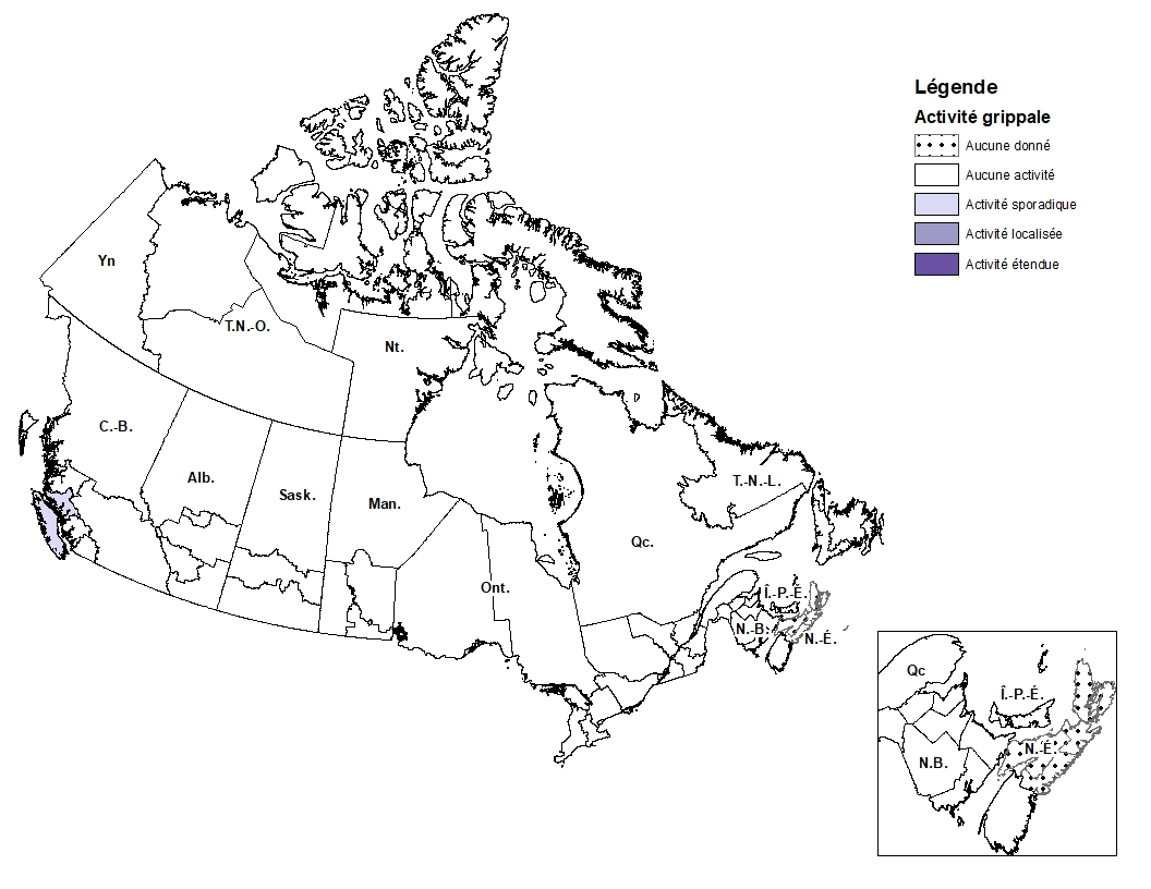 - Au cours de la semaine 43, l’activité grippale au Canada a été exceptionnellement faible, presque toutes les régions n’ayant signalé aucune activité grippale. Au cours de la semaine passée, tous les indicateurs de la grippe ont atteint des niveaux intersaisonniers exceptionnellement faibles.