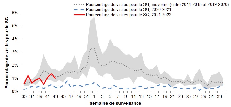- Le pourcentage de visites pour le syndrome grippal (SG) était de 1,0 % au cours de la semaine 43 et se situe dans les niveaux prévus.
