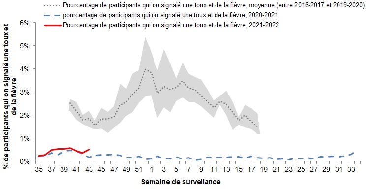 - Le pourcentage de personnes ayant déclaré de la fièvre et de la toux était de 0,5 % au cours de la semaine 43; cela reste en deçà des niveaux prévus et stable.
