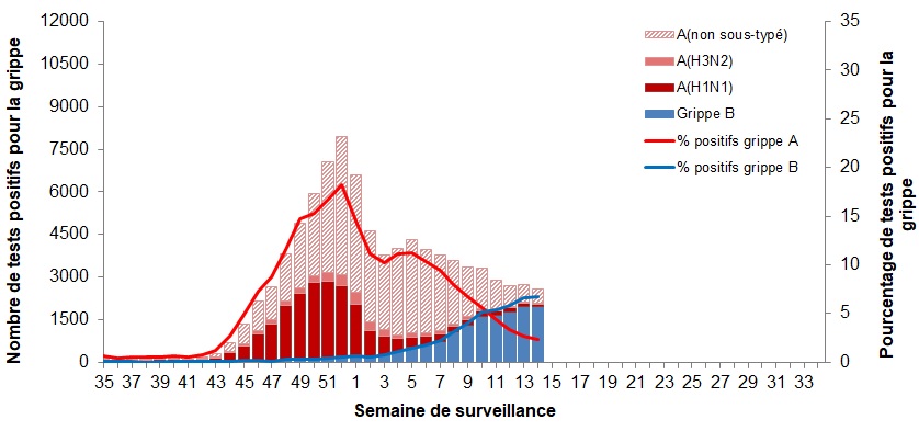 - Au cours de la semaine 14, le pourcentage de tests positifs pour l'influenza était de 9,0 % et un total de 2 611 détections en laboratoire (662 grippe A et 1 949 grippe B) ont été signalés.