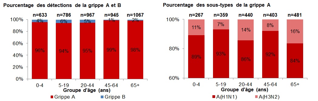 - 5 112 détections de la grippe ont été signalées, dont 96 % (4 902) étaient de type A et parmi les détections de grippe A qui ont été sous-typés (2 506), 87 % étaient la grippe A(H1N1).