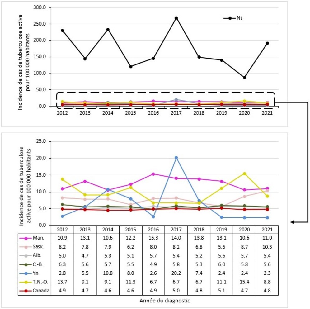 - Figure 2 : Incidence de la tuberculose active (pour 100 000 habitants) par province et territoire, SCDCT : 2012 à 2021
