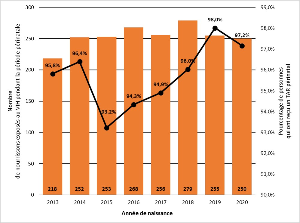 - Figure 8 : Nombre de nourrissons exposés au VIH pendant la période périnatale et proportion de nourrissons exposés au VIH pendant la période périnatale dont la mère recevait une thérapie antirétrovirale prénatale, par l'année de naissance, Canada, 2013 à 2020