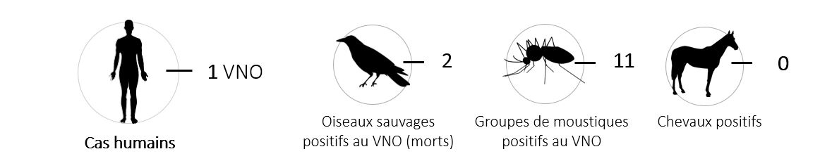 Entre le 1er janvier et le 25 juillet 2020, un cas humain associés au virus du Nil occidental ont été signalé à l'Agence de la santé publique du Canada. Deux oiseaux positifs au VNO, et 11 groupes de moustiques positifs ont été rapportés à ce jour.