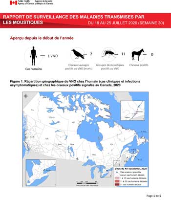 Entre le 1er janvier et le 25 août 2020, un cas humain associés au virus du Nil occidental acquis au Canada ont été signalé à l'ASPC. Au total, deux oiseaux et <1 % groupes de moustiques ont été testés positifs au VNO au Canada et ont été signalés à l'ASPC.