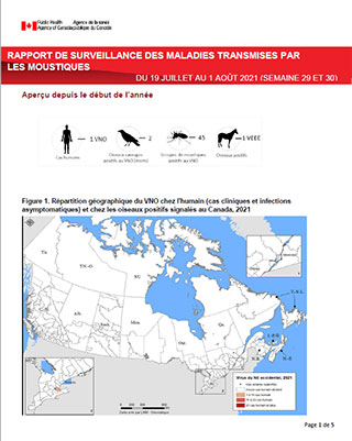 Entre le 1er janvier et le 1er août 2021, un cas humain associé au virus du Nil occidental acquis au Canada a été signalé à l'ASPC. Au total, deux oiseaux et 0,50% groupes de moustiques ont été testés positifs au VNO au Canada et ont été signalés à l'ASPC.