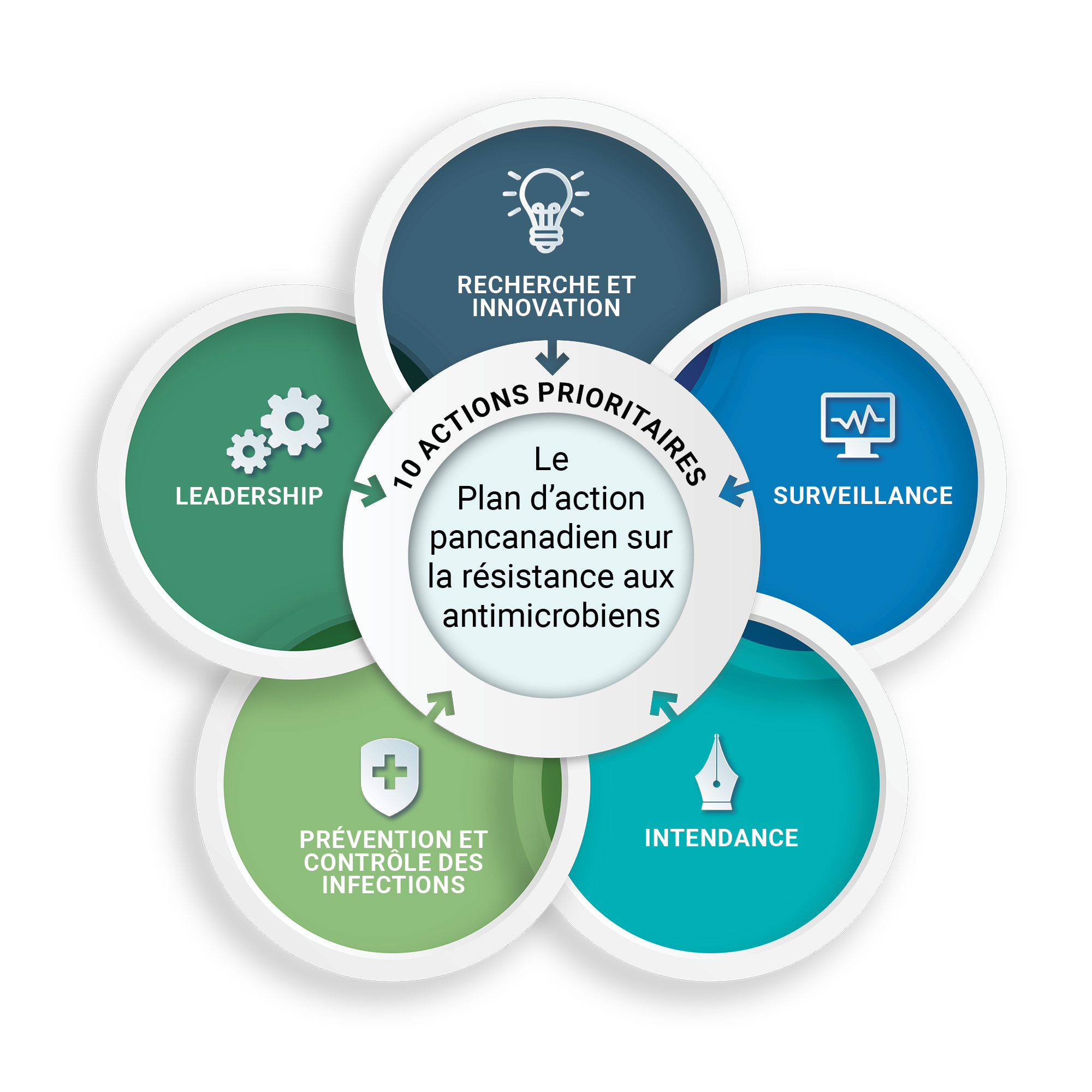 En juin 2023, les ministres fédéraux, provinciaux et territoriaux de la santé et de l'agriculture ont publié le Plan d'action pancanadien sur la résistance aux antimicrobiens (PAPC)Note de bas de page 4. Ce plan d'action quinquennal (2023-2027) visant à coordonner une réponse pancanadienne accélérée pour lutter contre la RAM. Il comporte 10 actions prioritaires partagées et dédiées, réparties sur 5 piliers :