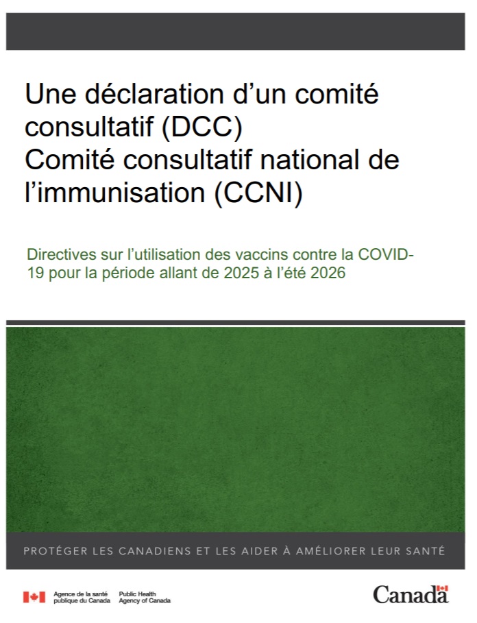 Plusieurs vaccins contre la COVID-19 ont été autorisés au Canada, et le CCNI a déjà publié des directives recommandant que les vaccins à ARNm et à sous-unités protéiques contre la COVID-19 puissent être utilisés chez les groupes d'âge autorisés pour une protection contre l'infection par le SRAS-CoV-2.Cette déclaration vise à faciliter la planification du programme de vaccination contre la COVID-19 pour 2025 et jusqu'à l'été 2026. Il est incertain quels produits seront disponibles pendant cette période; le chapitre COVID-19 du Guide canadien de l'immunisation (GCI) sera mis à jour pour refléter les produits disponibles, le cas échéant. Le CCNI continuera à suivre l'évolution de l'épidémiologie de la COVID-19 et des renseignements sur le vaccin et des directives actualisées seront fournies, le cas échéant.